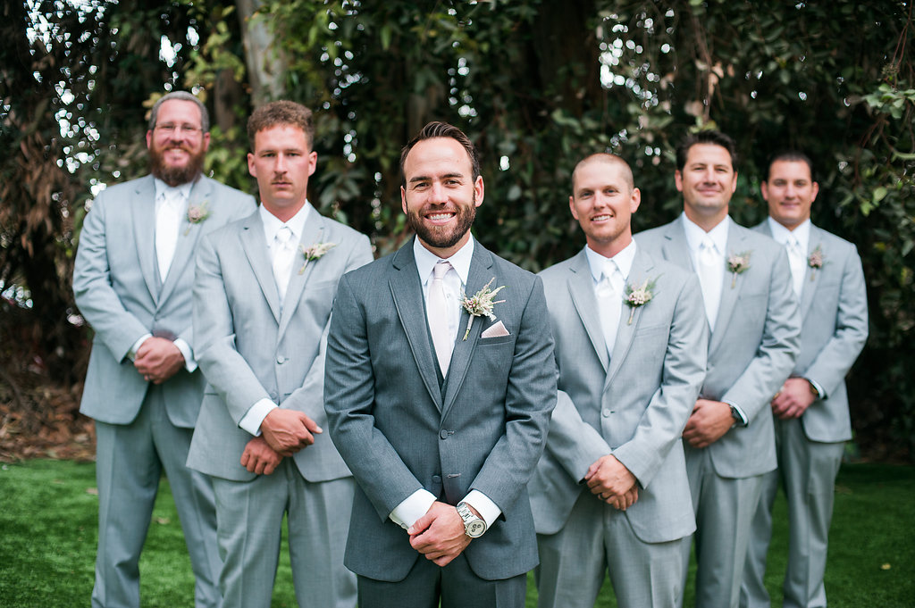 The groom and his men wear boutonnieres of waxflower and astilbe.